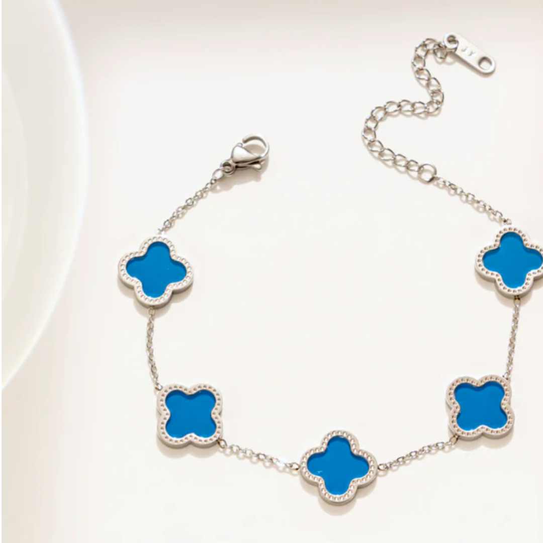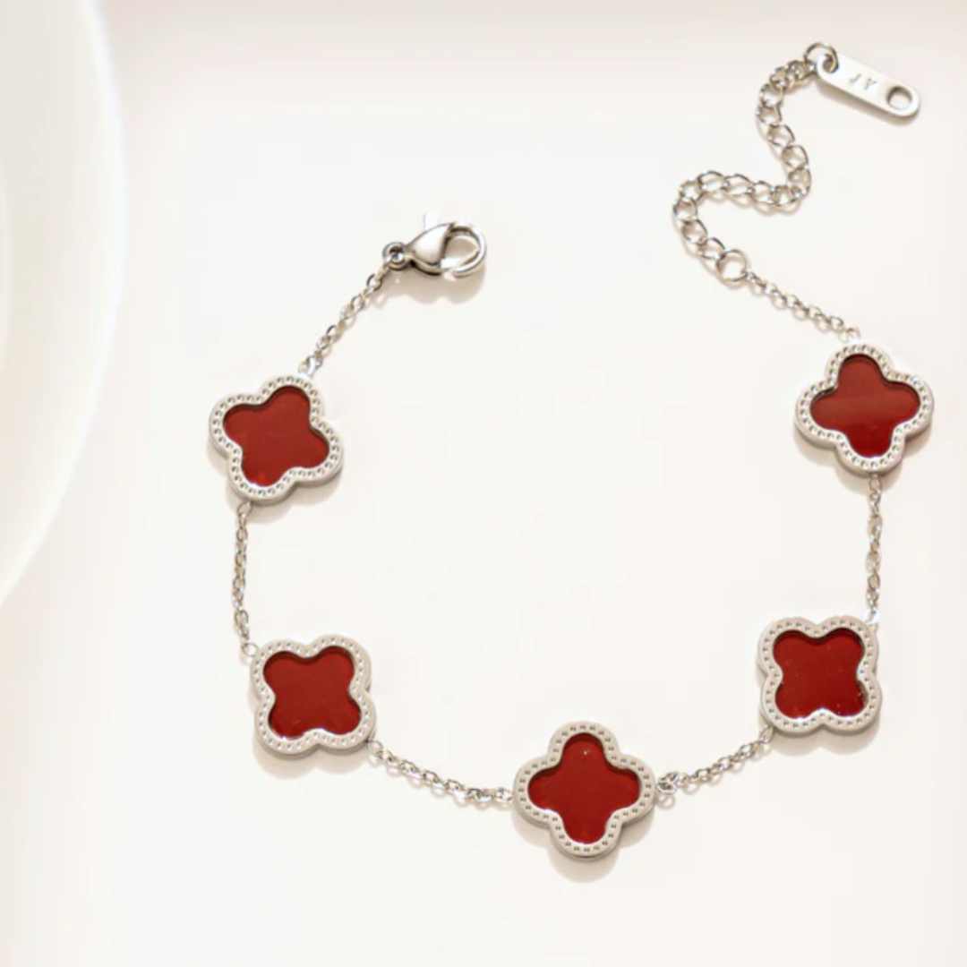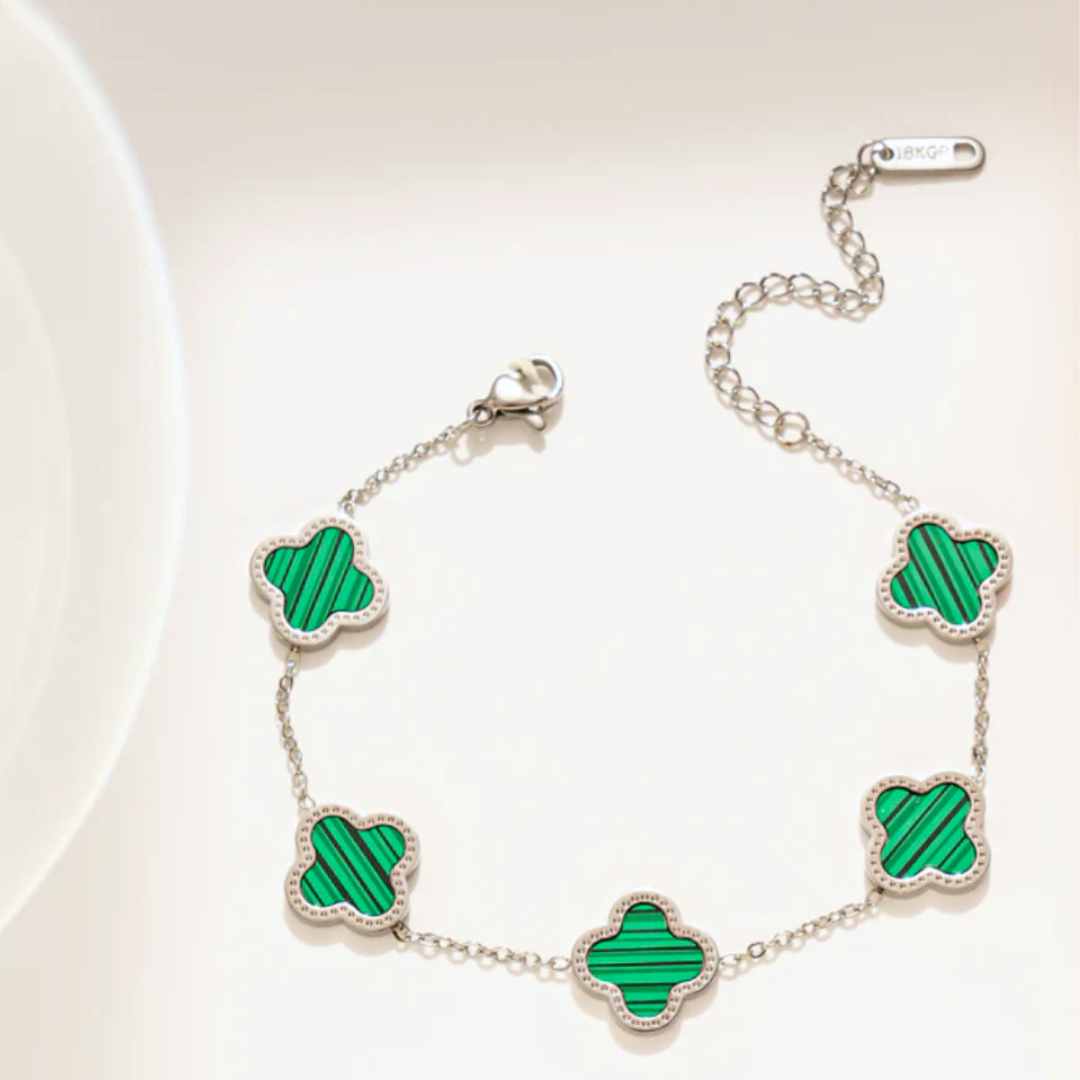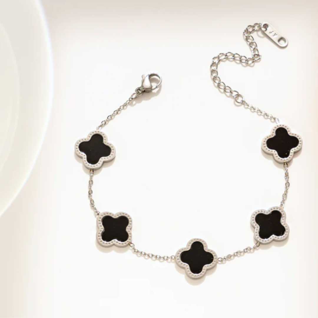 Dette tidsriktige armbåndet med kløverdesign er laget av titanium stål og er nikkelfritt, belagt med 18K gull. Smykket oppfyller EU-standarder, noe som sikrer høy kvalitet og trygg bruk.