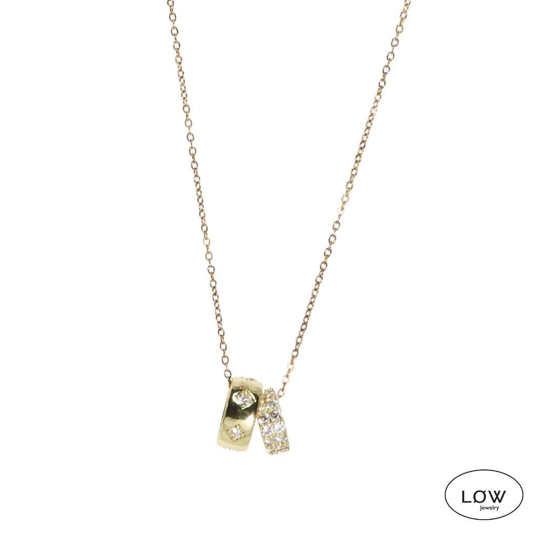 Et elegant halssmykke med doble ringer og glitrende zircon – et tidløst symbol på samhold og stil.