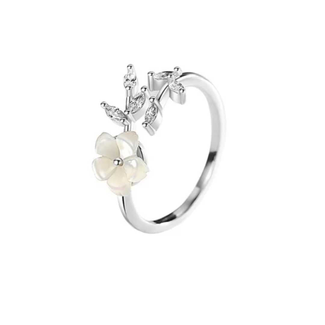 Denne tidløse ringen er laget av 925 sterling sølv, prydet med glitrende zirkonsteiner og en delikat hvit blomst som symboliserer renhet og femininitet. Perfekt som gave â eller for deg som vil skinne litt ekstra i hverdagen.